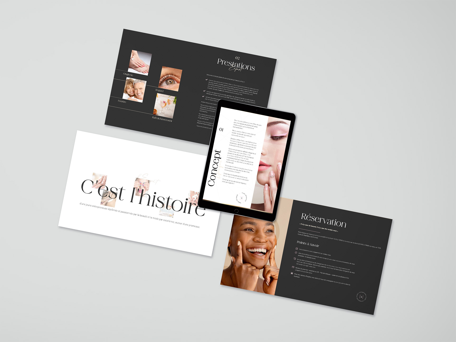 Ce projet se distingue par un design élégant, mariant typographie moderne et chic avec une palette de couleurs raffinées : blanc, doré, rose poudré et noir anthracite. Cette harmonie crée une ambiance féminine et sophistiquée.